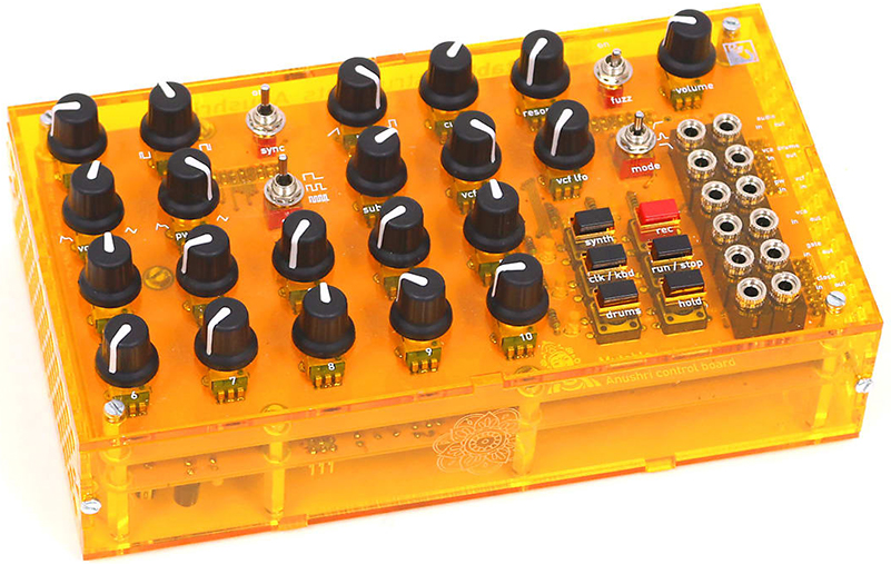 Anushri es un sintetizador monofónico con una ruta de señal totalmente analógica, emparejado con un sintetizador de batería digital lo-fi. Estas dos secciones están controladas por un secuenciador/arpegiador integrado, con secuenciación generativa de patrones de batería. Anushri se abre al mundo modular gracias a su área de patcheo analógico.