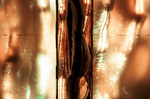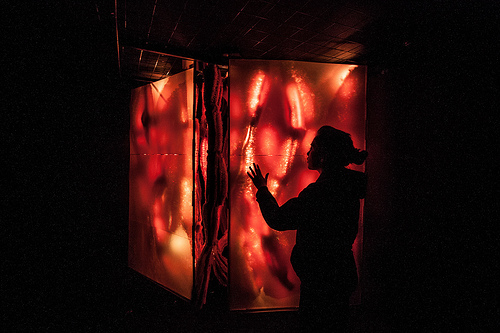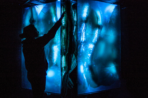 “Dispersión cromática explora el comportamiento de la luz; la forma en que la luz viaja a través de un material poroso, descomponiendo los LEDs en sus colores RGB que los componen. El ritmo y el color de los LEDs que cambian lentamente revelan las proporciones relativas del RGB que constituye el color global de la instalación. El material orgánico poroso crea un efecto visual especial cuando la luz atraviesa su cuerpo, algo parecido a un colorido vitral.
