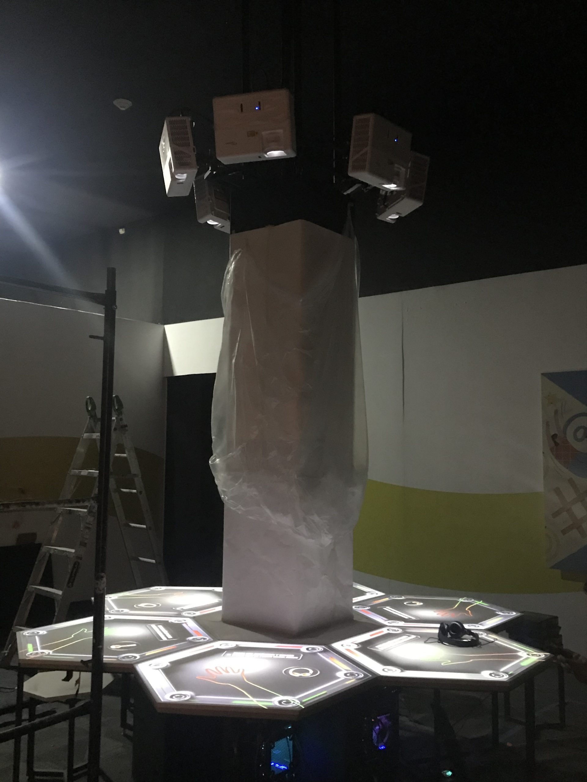 Para la sala “La tercia del dolor” implementamos una serie de sensores capacitivos en las seis mesas hexágonales de la sala, estos sensores disparaban la señal de activación para iniciar el video mapping que se proyectaba sobre el brazo de la persona que estaba interactuando con la pieza.
