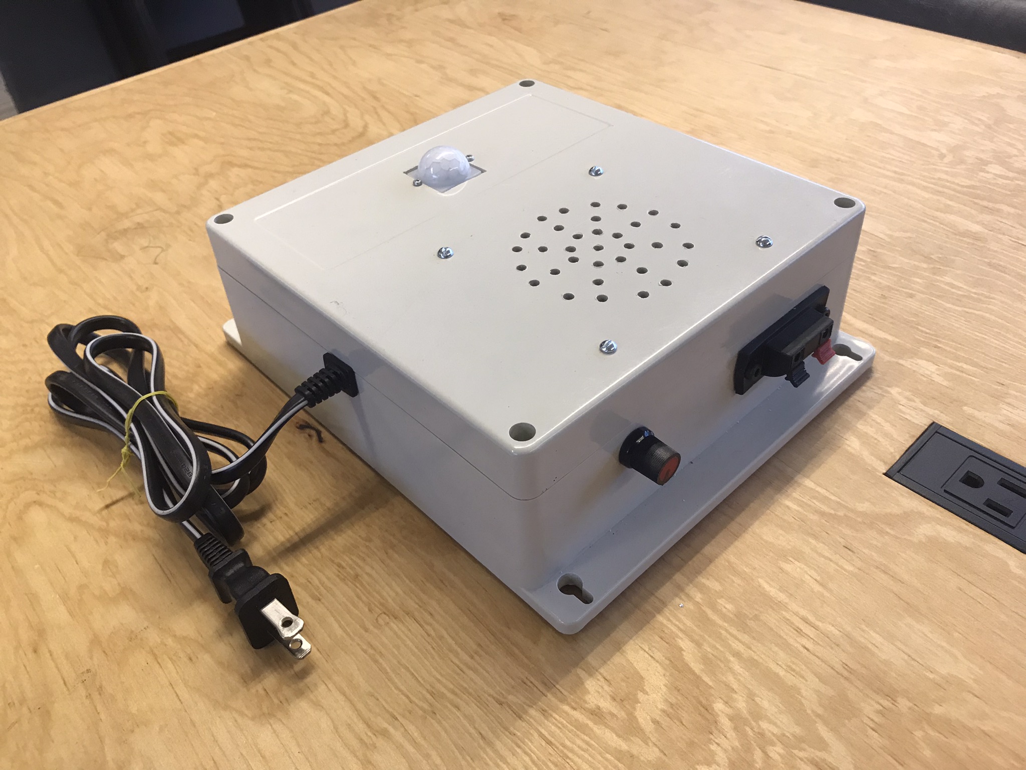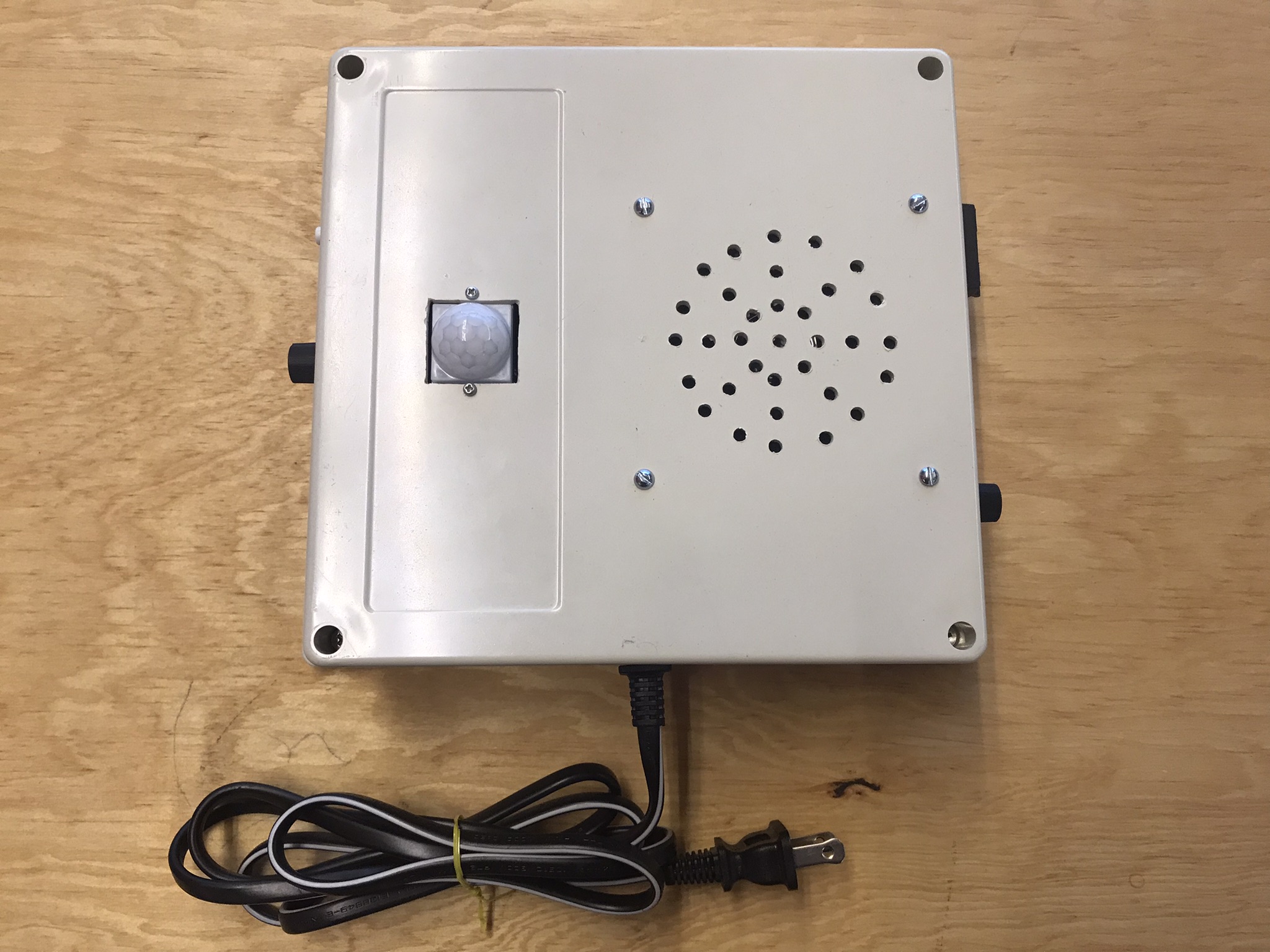 Para esta instalación desarrollamos un sistema electrónico de reproducción de audio activado con sensor de presencia.
