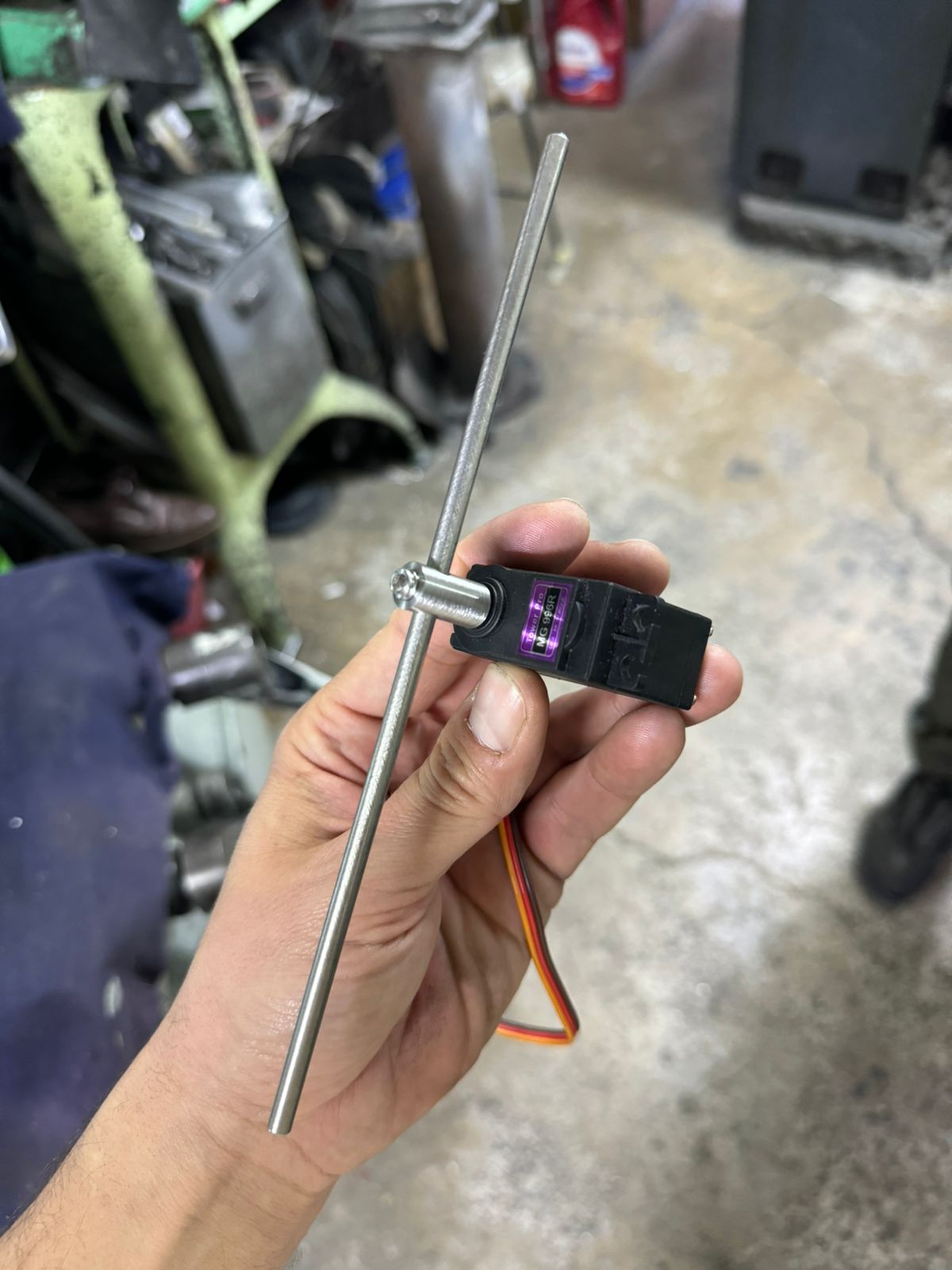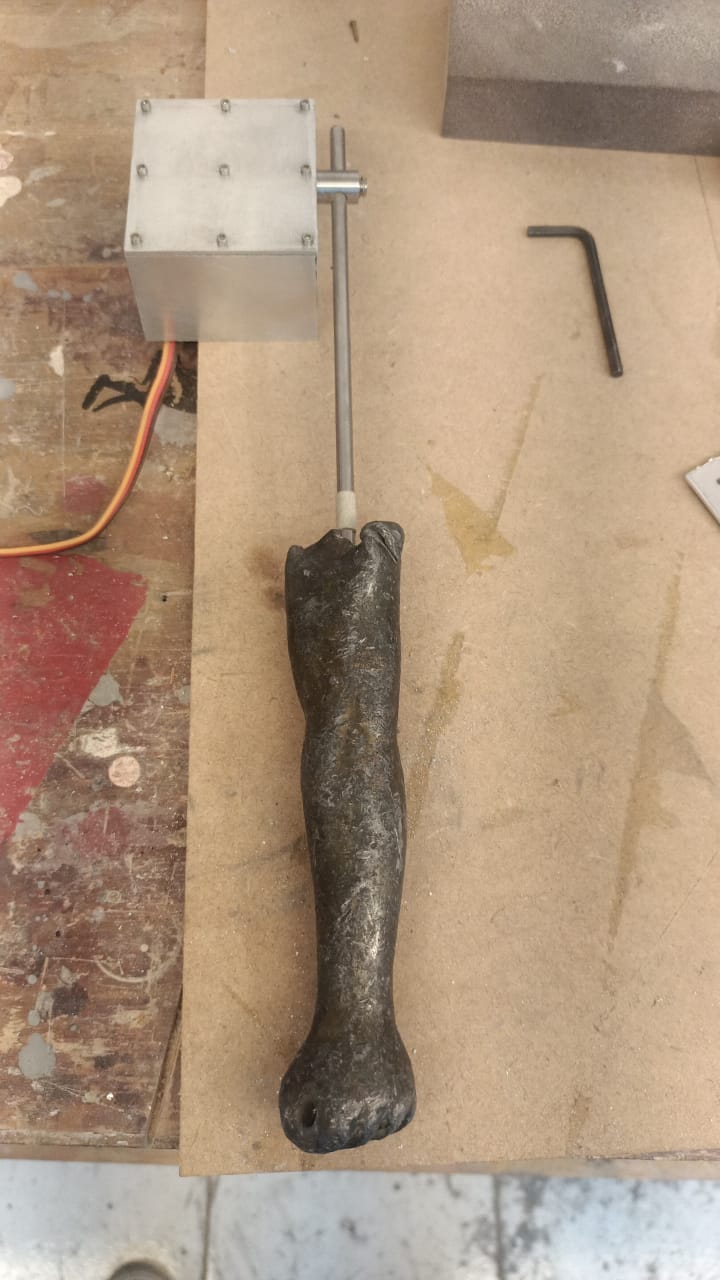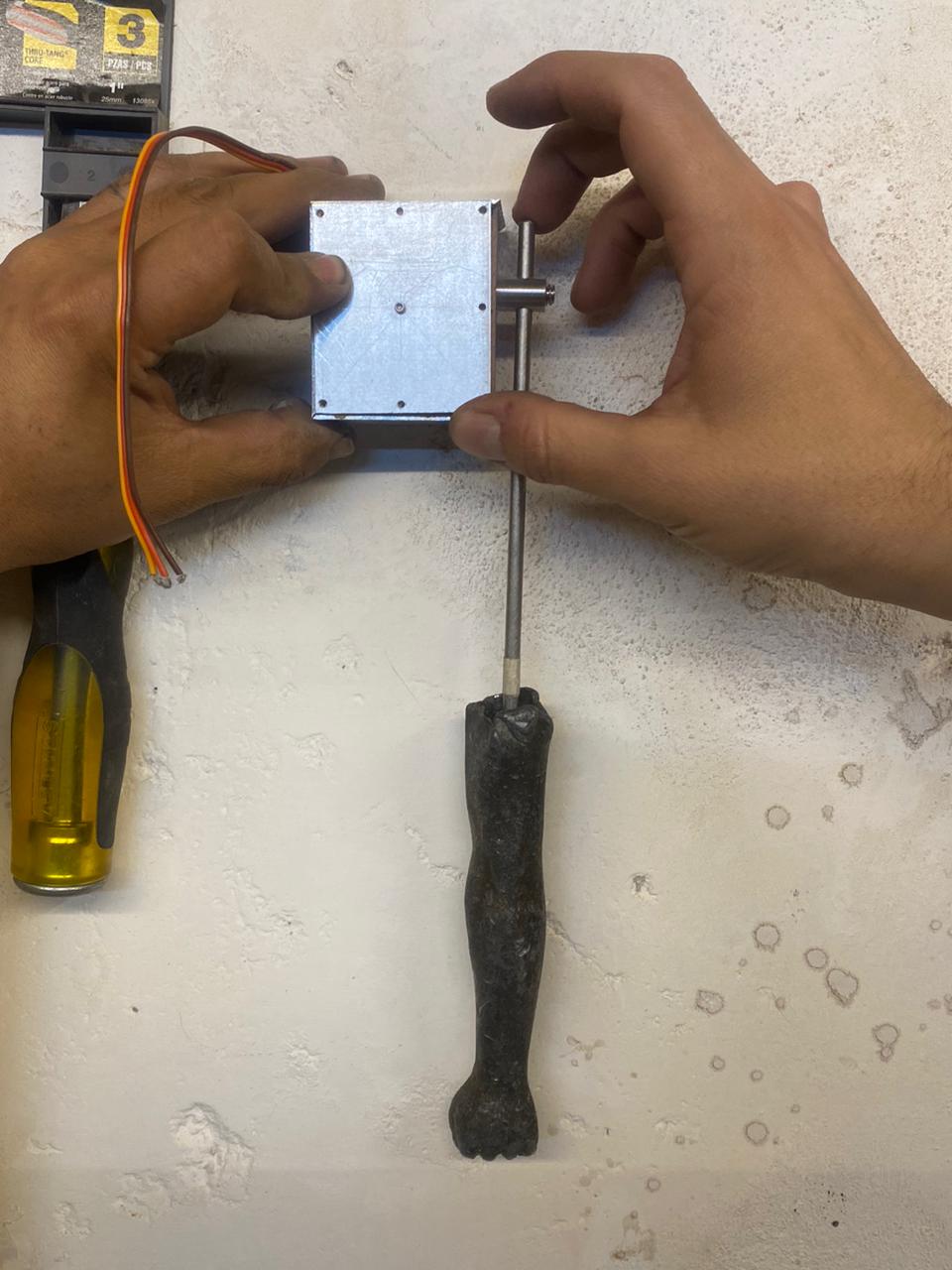 Por un lado, mediante un servo motor, dimos movimiento a una mano que golpeaba una tabla conforme a un código ASCII que el artista proporcionó.