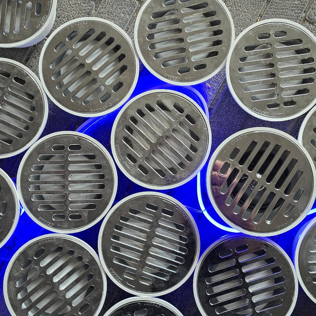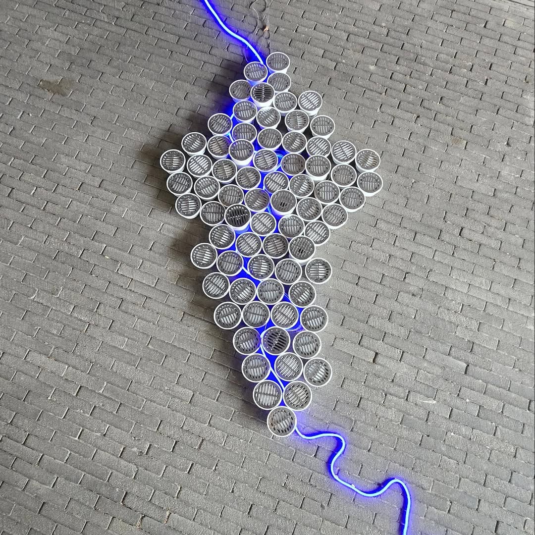 “La instalación se compone de un conjunto de coladeras cuya forma asemeja la figura del Estado de Nuevo León y es atravesada por una luz. Algunas coladeras, tienen en su interior bocinas que emiten sonidos de ríos de Nuevo León. Esta pieza forma parte del proyecto Artilugios del agua es la consecuencia formal o traducción plástica de una serie de investigaciones que he realizado en sus últimos años sobre el agua en México. En estos proyectos he documentado testimonios, conocimientos y experiencias de las relaciones que las comunidades han desarrollado a lo largo del tiempo con el agua, a partir de un acercamiento y encuentro entre diversos saberes, estéticas y materialidades, insertados en un contexto actual tenso y problemático con respecto al uso y usufructo del agua como recurso, en las grandes ciudades y que en los últimos años ha sufrido una intensa sequía según ha reportado la Comisión Nacional de Agua de México.”